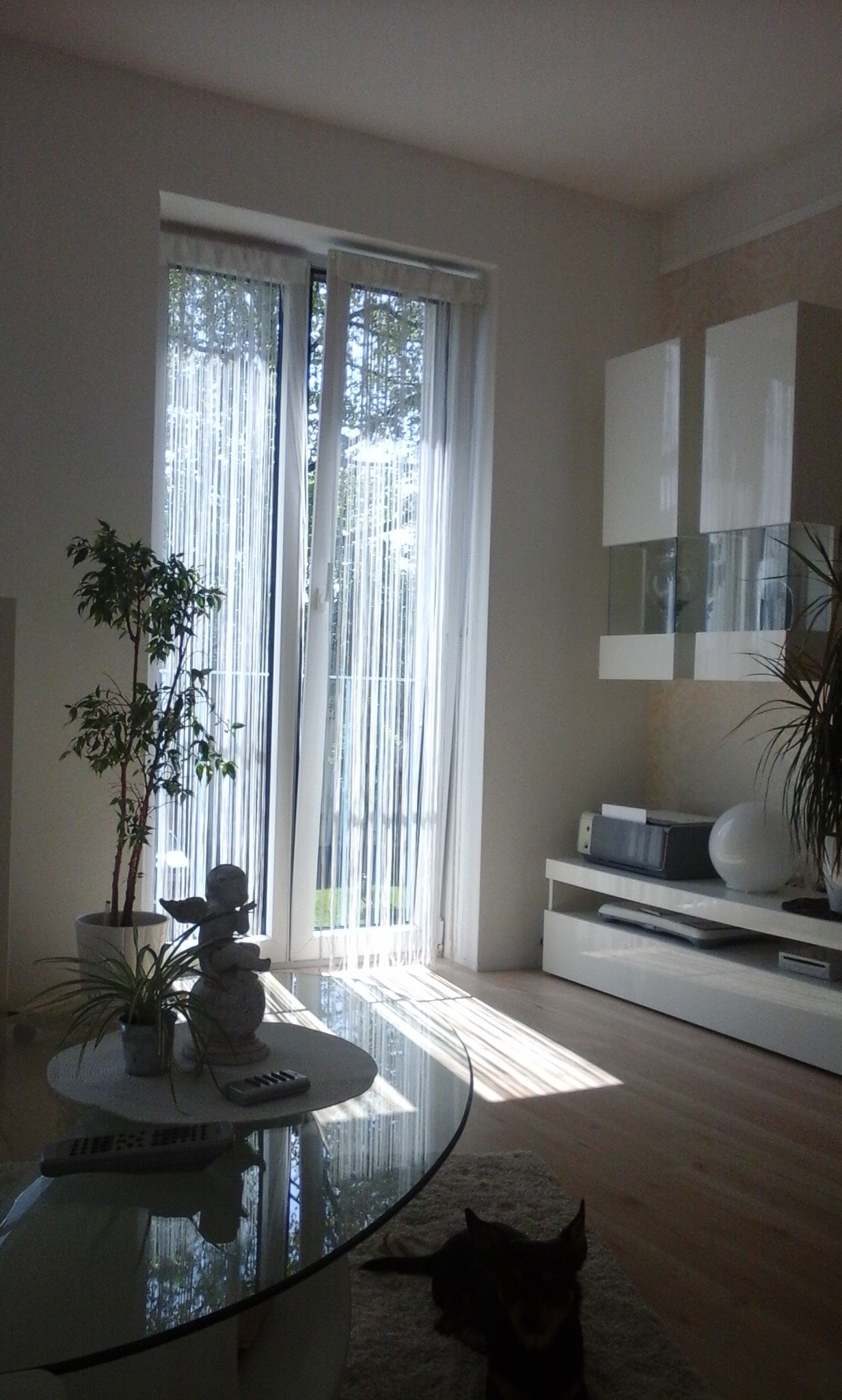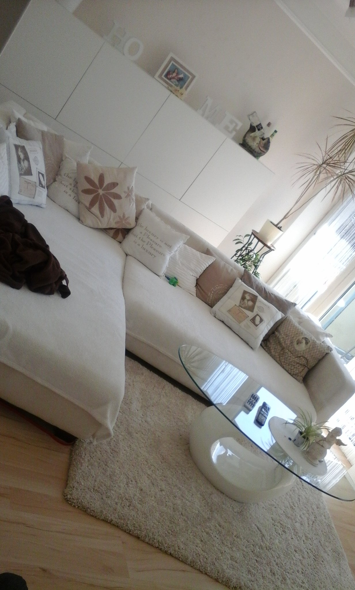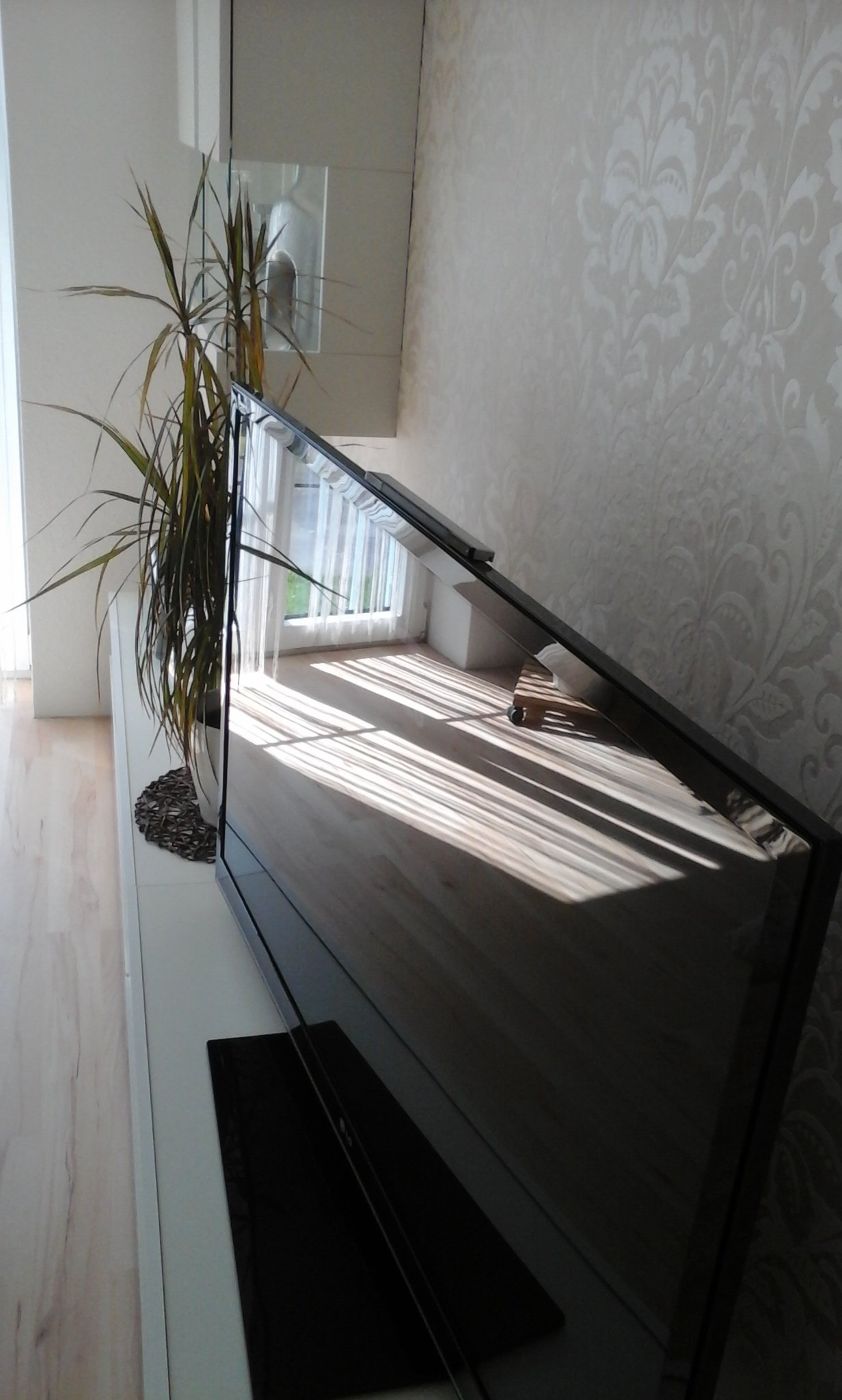 Hier ein kleiner Einblick in unser gemütliches Wohnzimmer. Hier regieren die Erdtöne mit modernen Hochglanz Möbeln, Besonderes Highlight ist die Tapete im Barock-Stil, tolles Design mit Glanz *