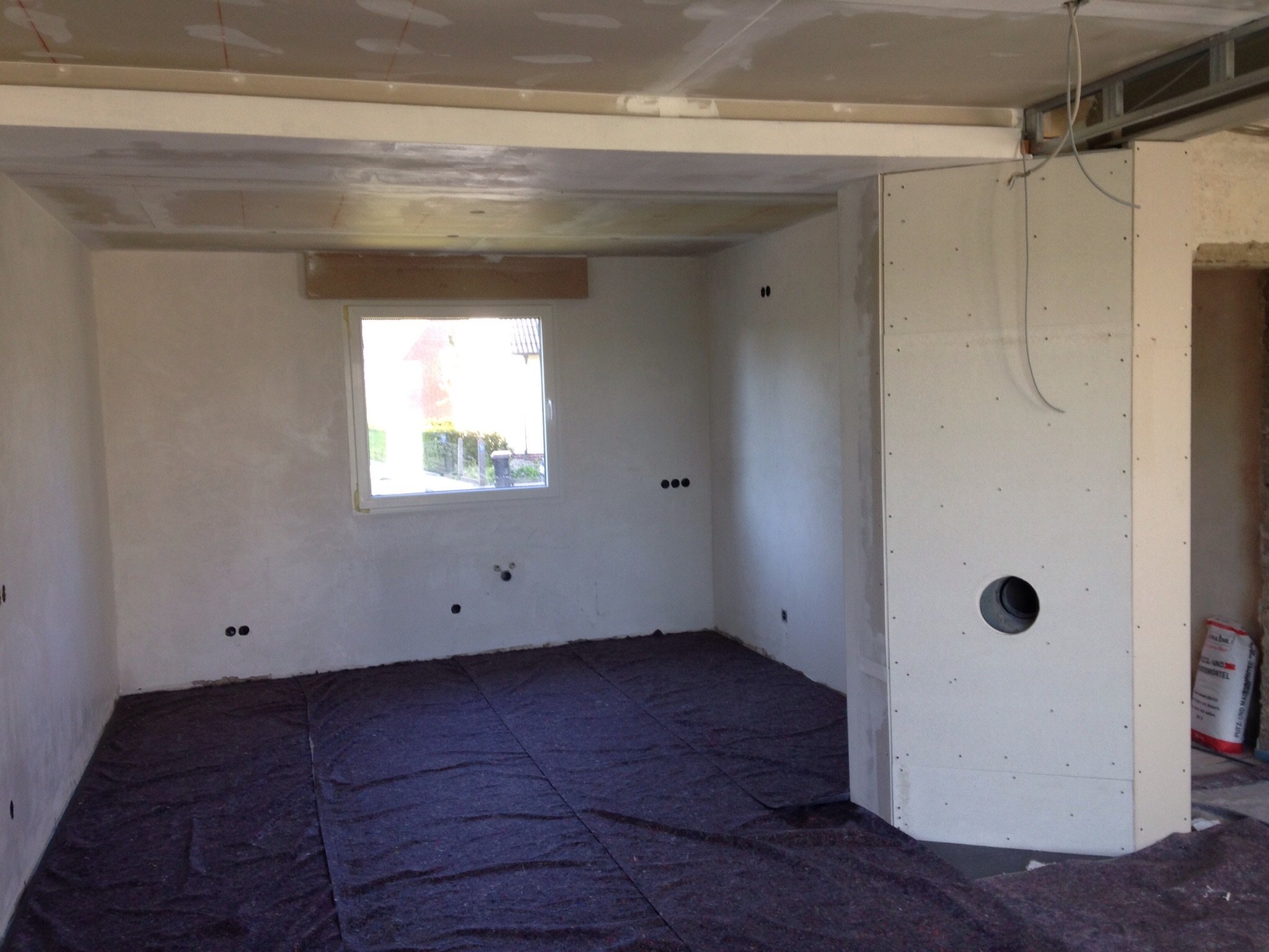 15.05.2015: Die Fliesen zum Schutz abgedeckt, die Wände schon einmal gespachtelt. Der Kamin wird später mit Schieferriemchen verkleidet und der Ofen ist bestellt.
