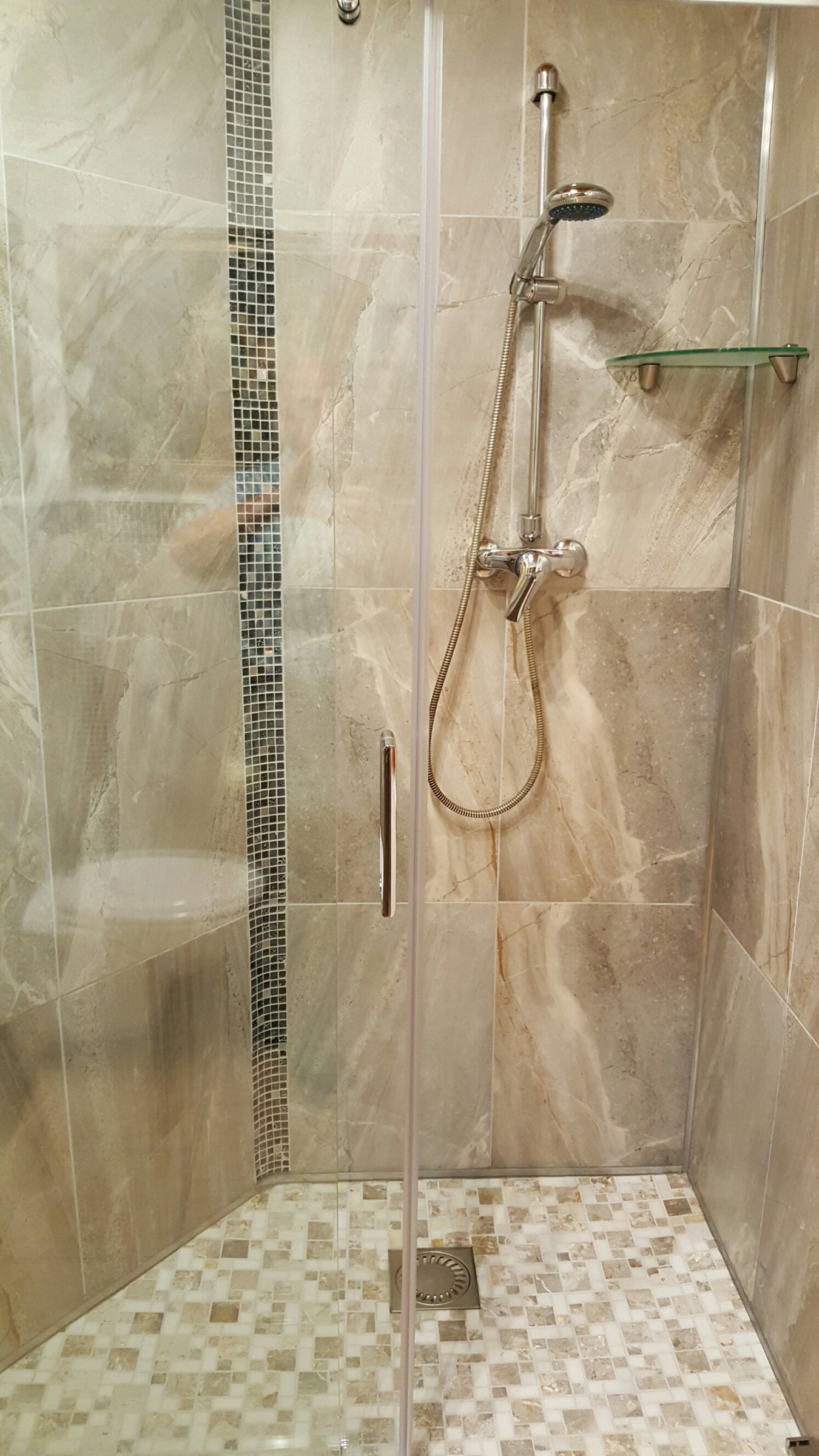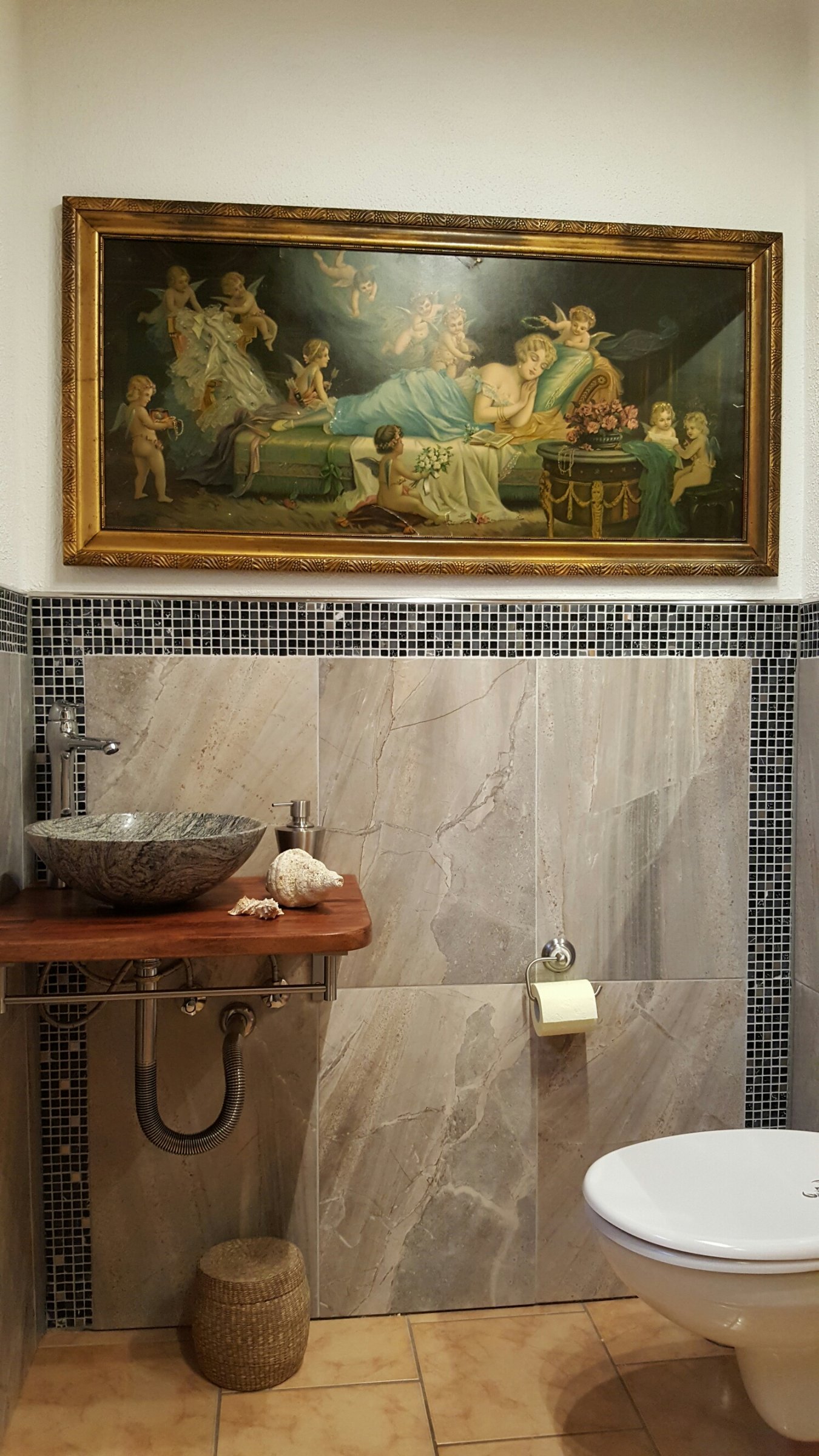 9.623Für mein Gästebad habe ich ein kleines Granit Waschbecken ausgewählt. Montage auf Massivholzplatte war kein Problem. Bodengleiche Dusche mit Marmormosaik.