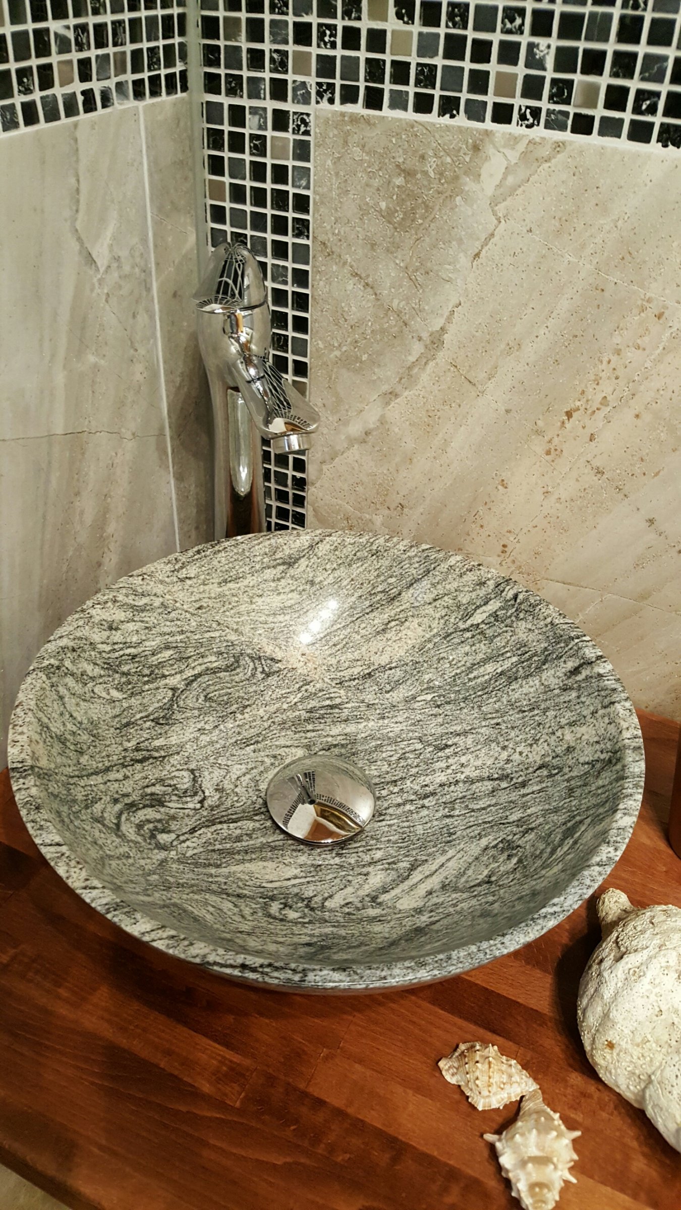 Für mein Gästebad habe ich ein kleines Granit Waschbecken ausgewählt. Montage auf Massivholzplatte war kein Problem. Bodengleiche Dusche mit Marmormosaik.