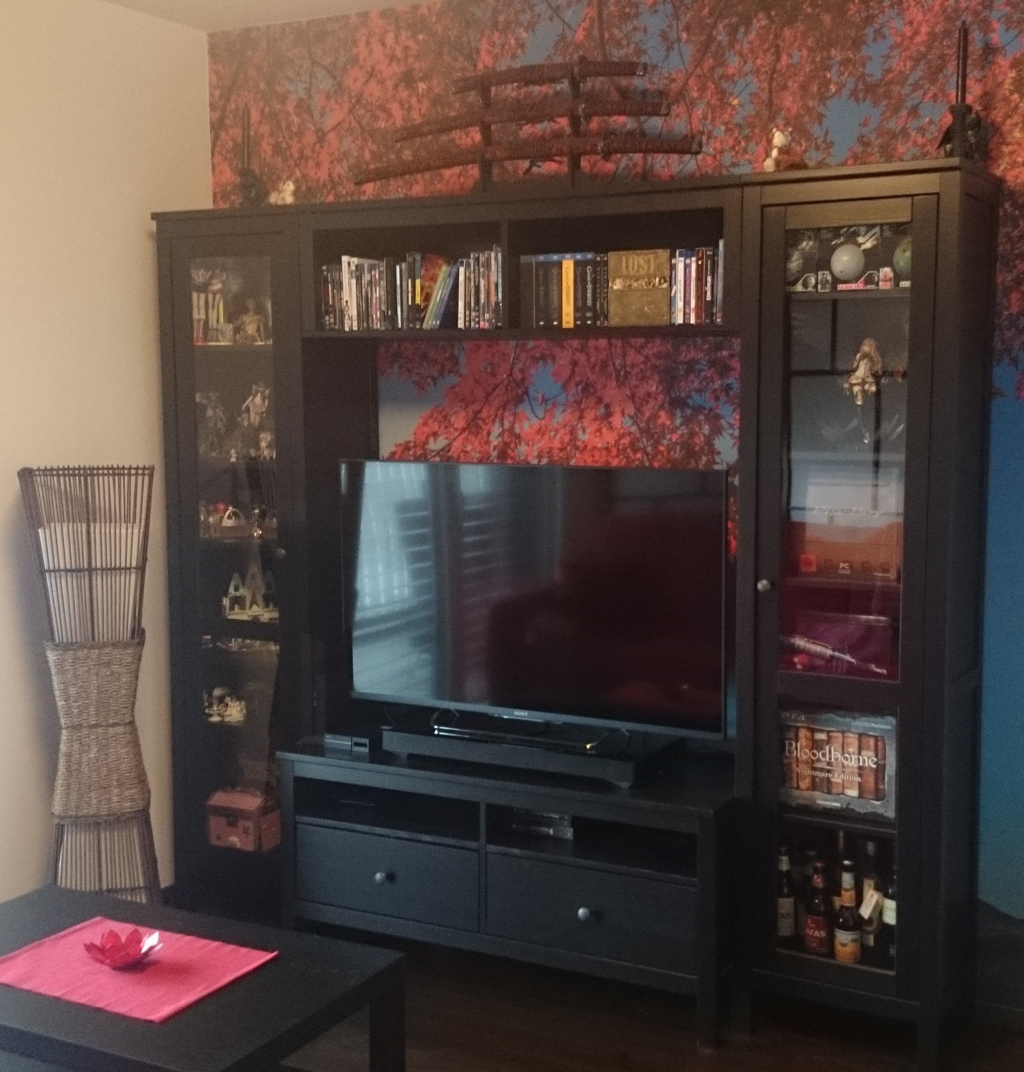 Die Wohnwand vor einer Fototapete, in der Äste eines herbstlichen Ahornbaum in Bild hängen - in der Mitte des Bildes wäre eigentlich der Fuji, aber der Fernseher verdeckt ihn leider. :-(