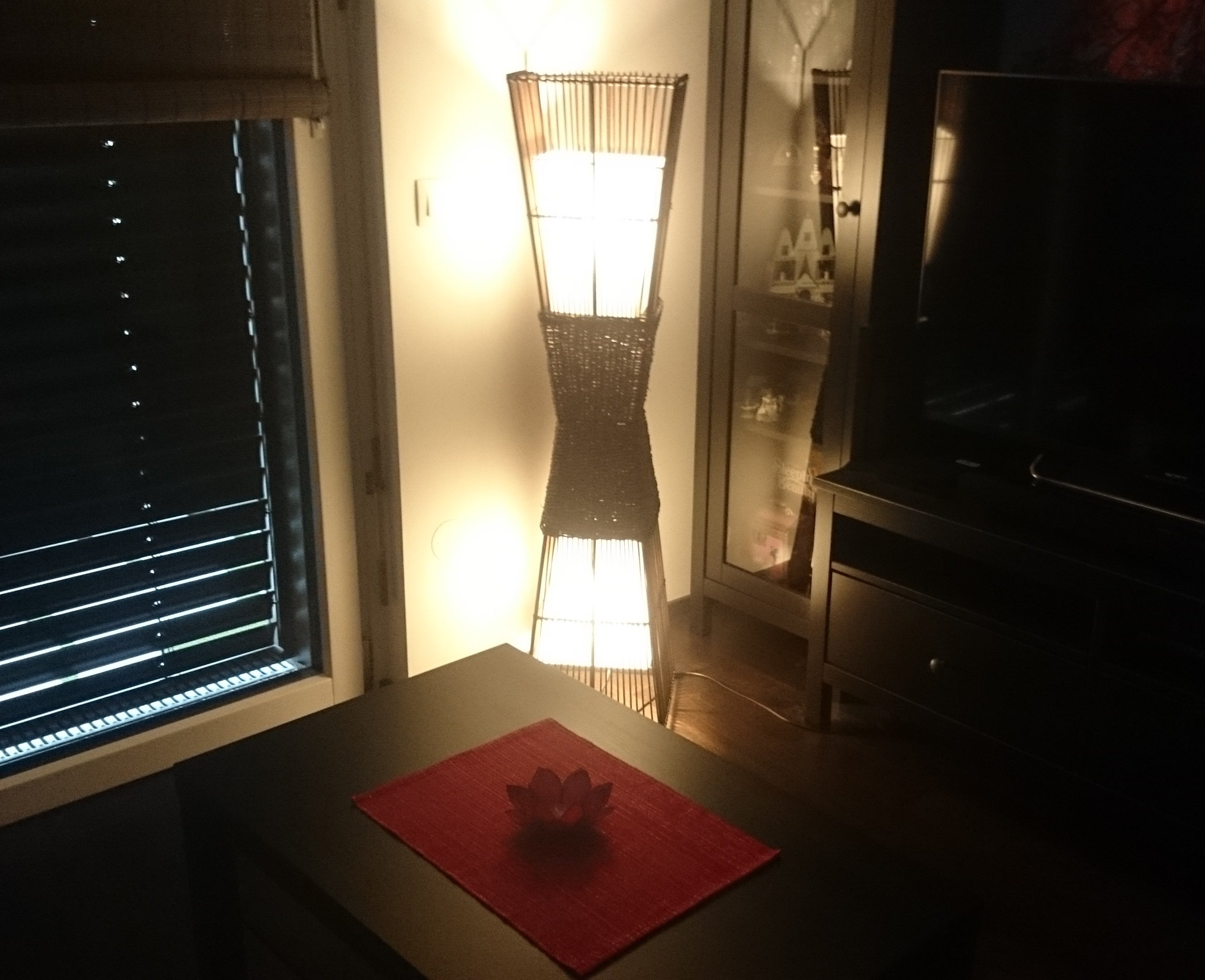 Abends schalte ich gerne die Stehlampe ein, sie gibt ein total angenehmes Licht. Die Fenster haben übrigens die gleichen Bambusrollos wie im Esszimmer.