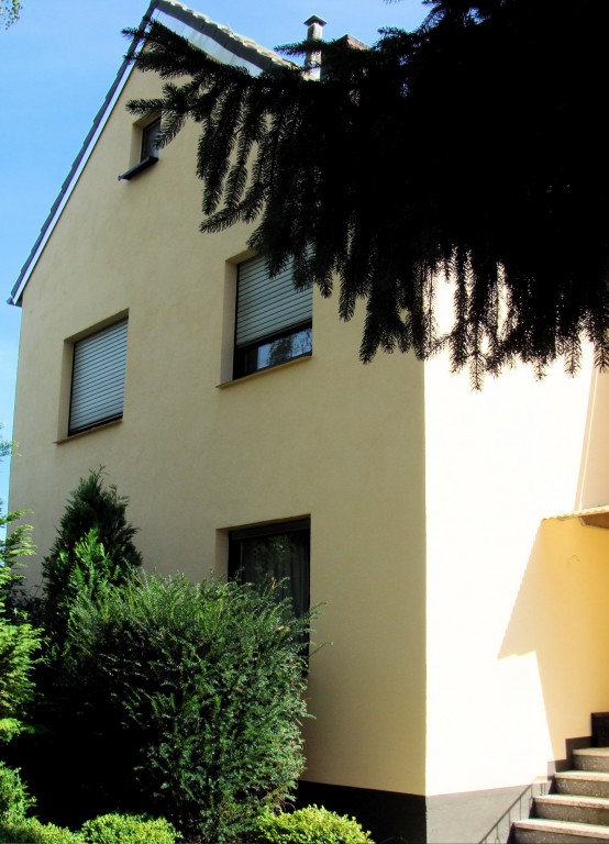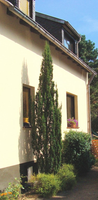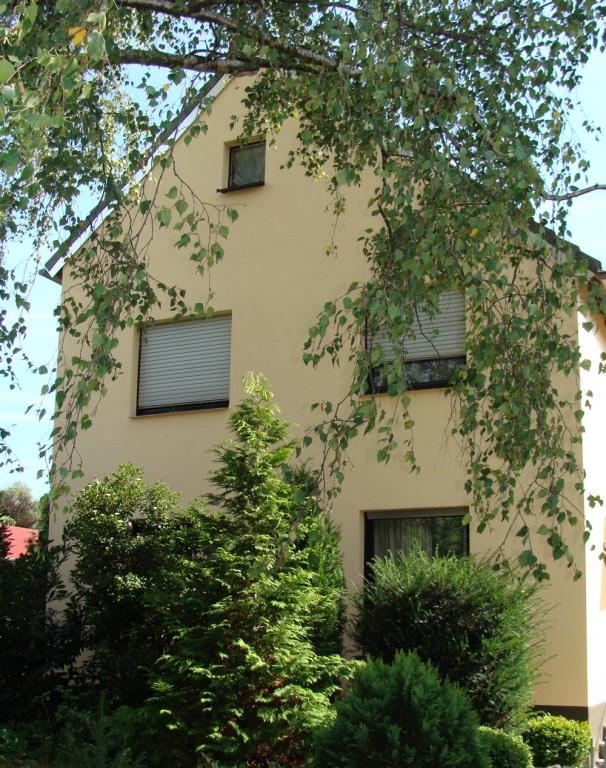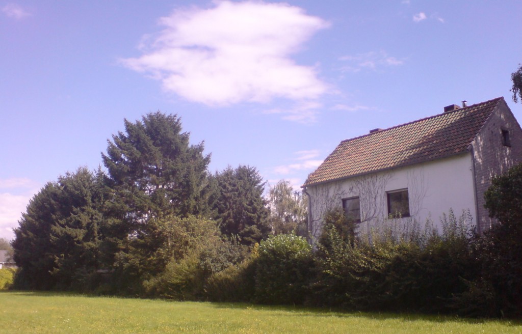 Unser Haus mit Garten aus der Ferne betrachtet. Unser Haus wurde nun in Aprikot gestrichen!