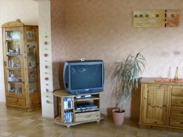 16.627Wohnzimmer Parkettboden, der 2006 neu abgeschliffen und versiegelt wurde. Möbel: Kiefer gelaugt/geölt. Irgendwann gibt's auch mal eine neue Couch ...!