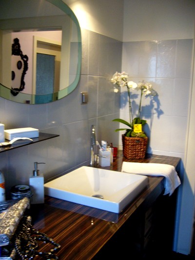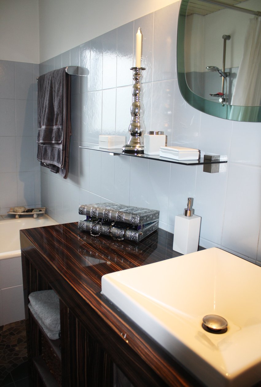 Der Waschtisch ist auch Marke Eigenbau. Grundstoff sind MDF-Platten, auf die wir dann ein selbstklebendes Echtholzfunier gezogen haben. Bearbeitung nicht ganz so einfach wie beschrieben war, aber mit ein bisschen geschick auch zu lösen.