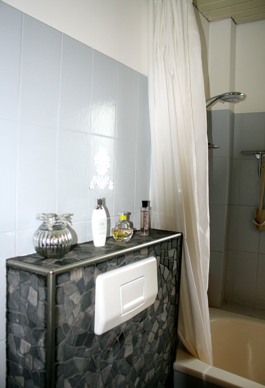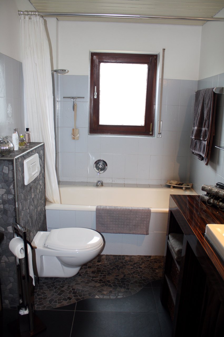 24.479Das ist unser kleines schnuckeliges Badezimmer, was wir aus seinem 70er Jahre Retrolook Dornröschenschlaf geholt haben. Fliesen wurden mit Fliesenlack von Retrobraunorange in hellgrau umgestrichen.