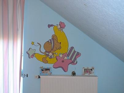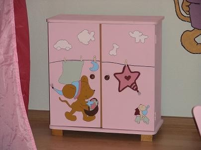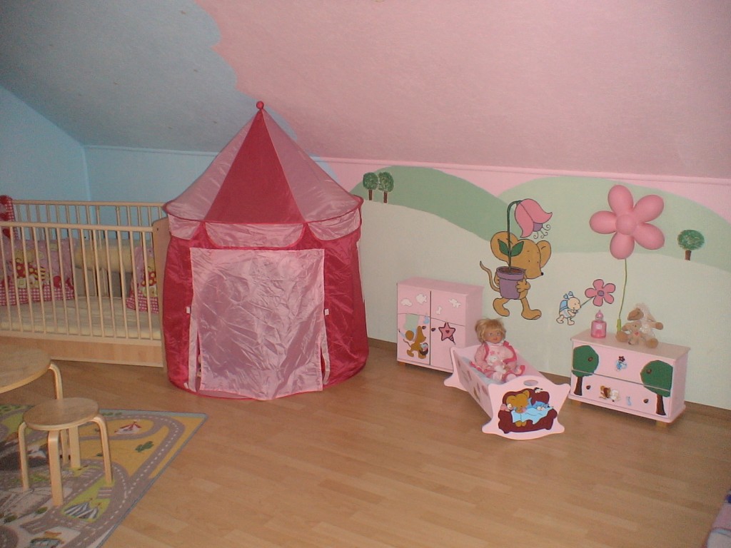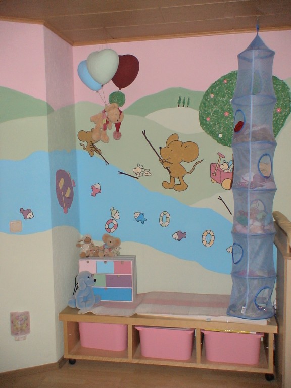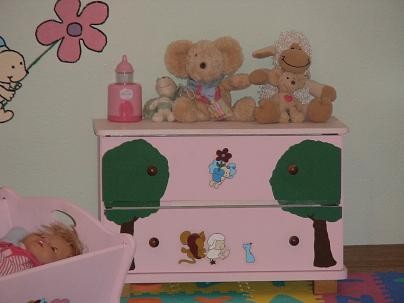 28.361Die Vorlagen für dieses Zimmer habe ich aus der Zeitschrift "Lillebi". Wir hatten einen Beamer was uns natürlich viel Zeit ersparte. Trotzdem habe ich mit einer Freundin gute 20 Stunden gemalt. Die Puppenmöbel habe ich auf dem Flohmarkt gekauft für zusammen 6€. Ich habe sie erstmal komplett rosa gestrichen und dann mit weißen Servietten Bilder aus der Zeitschrift abgepaust. Mit Tapetenkleister die Servietten draufgeklebt und anschließend ausgemalt. Für die Lillebi mit den Ballons habe ich Herzluftballons mit Zeitung beklebt und wieder ausgemalt.