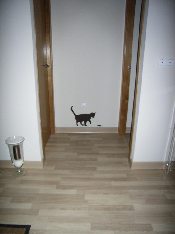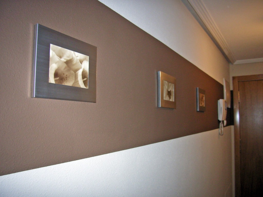 Da wir einen langen schmalen Flur haben, in dem man kein Möbelstück oder Deko hinstellen kann, haben wir uns gedacht eine Wand mit einem Schoko-braunen Streifen zu verzieren in dem wir kleine Bilder mit Edelstahlrahmen aufgehängt haben.