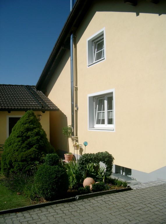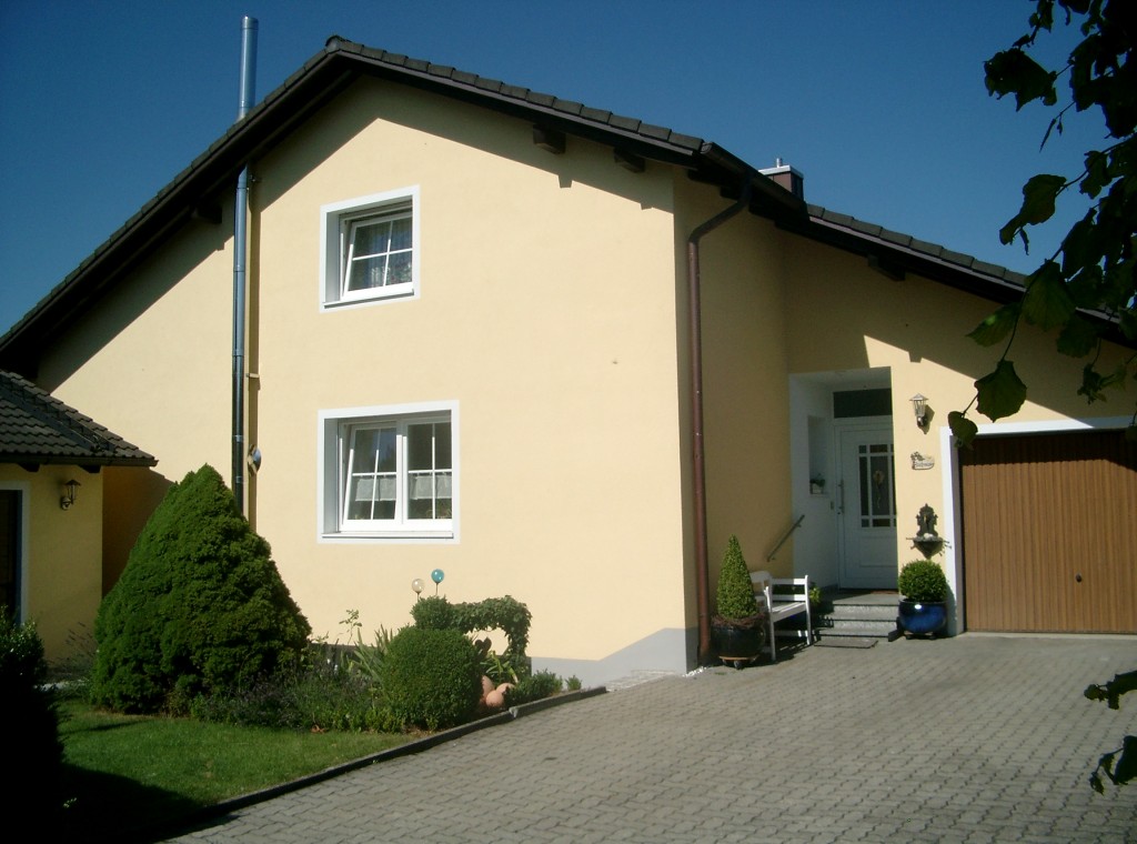 23.745Das Haus wurde in den 70er Jahren gebaut und war ursprünglich mit Eternittafeln in beige und braun verkleidet. Jetzt ist ein Vollwärmeschutz mit 14 cm Steinwolleisolierung und ein Silikatharzputz angebracht worden. Auch die Fenster und die Haustüre wurden erneuert. Für den Schwedenofen im Wohnzimmer mußte ein Kamin installiert werden. Wir haben uns für einen Außenkamin aus Edelstahl entschieden.