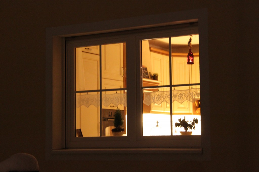 Blick von draussen in die Küche...die kleinen Häkelgardinen mit Herzchen und Röschen habe ich selbst gemacht :o)))