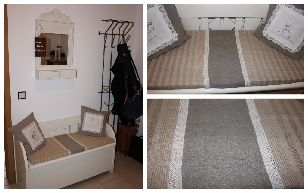 aus 2 alten Geschirrtüchern, etwas Leinenstoff vom Schweden und Omas Spitze habe ich mir endlich einen neuen Überzug für die Bank genäht...