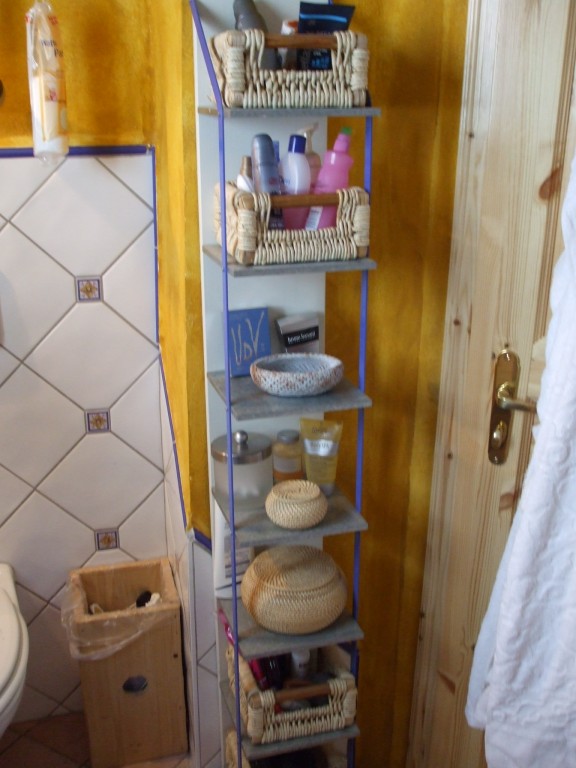 Das Regal war eigentlich mal für CDs gedacht. Mit den Körben wirkt es nicht mehr ganz so gerümpelig. Man beachte auch den aus einem missglückten Nistkasten umfunktionierten sehr dekorativen Mülleimer. ;-))