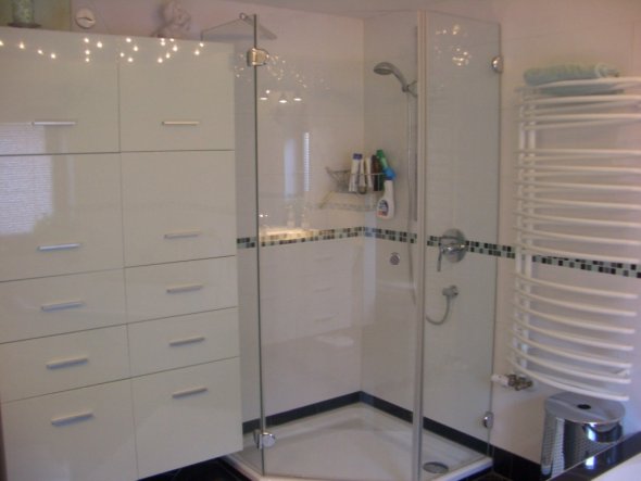 Unser Badezimmer war vor dem Umbau ein Kinderzimmer. Die Schränke bieten sehr viel Stauraum und so liegt nichts umher. Hier geniese ich öfters ein Bad unter dem Sternenhimmel.