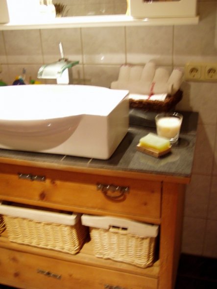 Das Bad wurde von uns umgebaut, es hat ca. 15m2 und war vor dem Umbau WC und Speisekammer. Das Badezimmer kann über den Kachelofen mit geheizt werden.