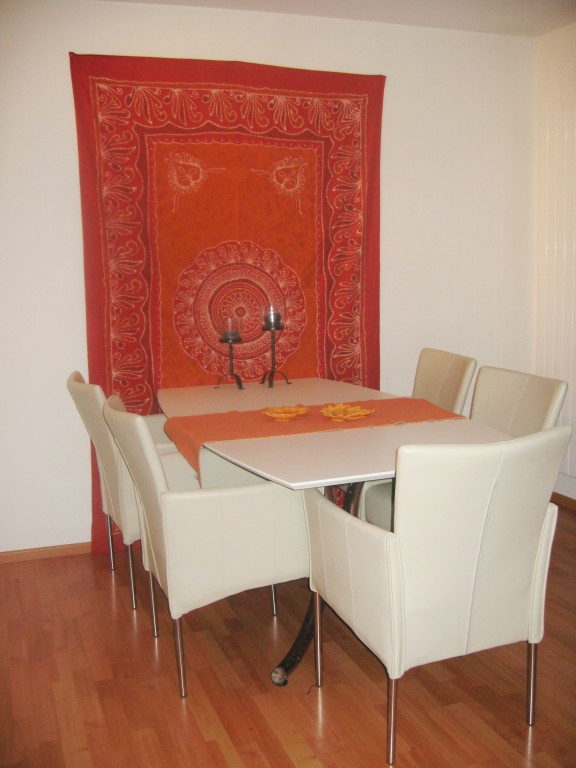 Wollte immer mal einen Teil der Wand farbig haben, aber gleich mit Farbe auf die neuen Wände... ne da fehlt mir der Mut! Jetzt habe ich einfach mal ein Tuch aufgehängt.