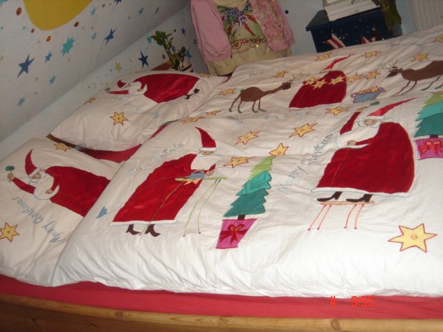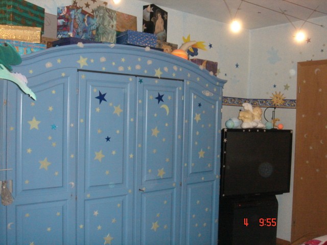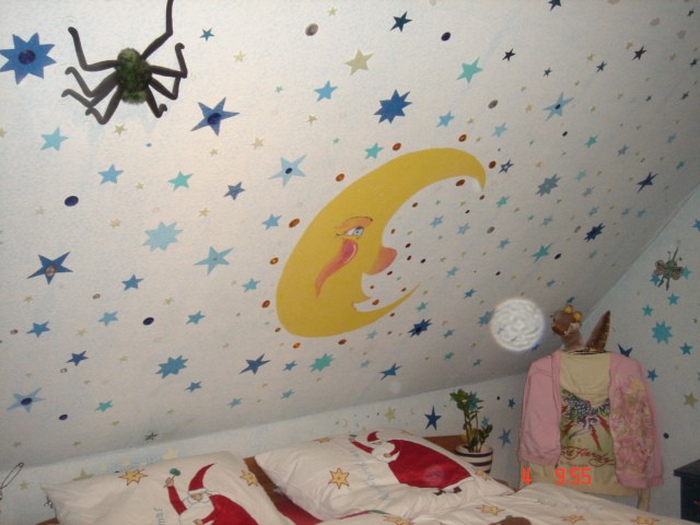 ...die Sterne und den Mond hab ich alle unter die Decke gemalt....es hängen ungefähr 300 Leuchtsterne an den Wänden und an der Decke, sieht nachts traumhaft aus...