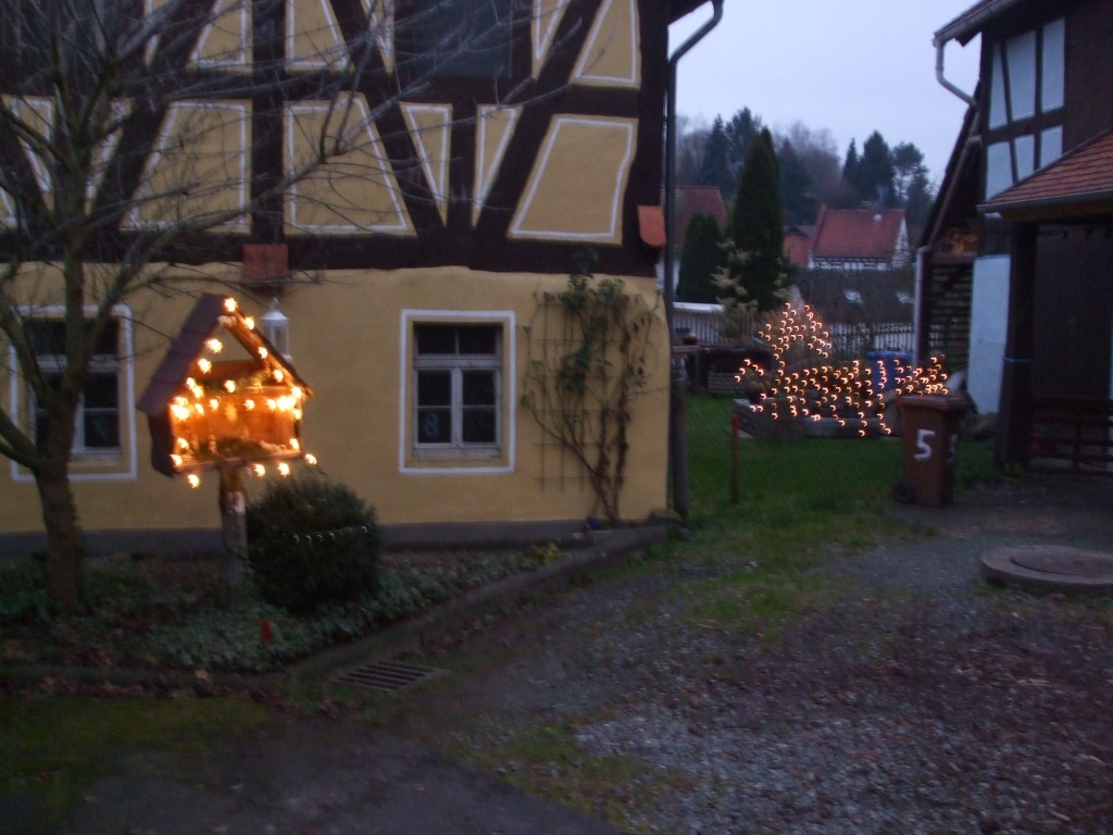 ALT:wir hatten in den vergangenen Jahren von amerikanischer Totalbeleuchtung des Fachwerks bis zu dieser Variante schon alles. Leider lohnt es sich nich die Lichterketten zu reparieren, denn eine Kette mit 180 Birnchen nach der einen kaputten zu durchsuchen ist ätzend. Wir habens aufgegeben und besinnen uns wieder auf ausgesuchte Fensterdeko und einzeln plazierte Außenlichter.
