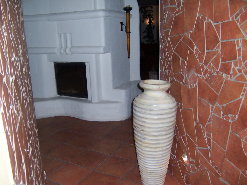 Hier ein Blick vom Eingangsbereich, durch einen kleinen Durchgang auf den Kamin im Wohnzimmer. Den Durchgang haben wir einfach mit den restlichen Fliesen verschönert...alle kaputt gemacht und als Mosaik an die Wände gebracht!