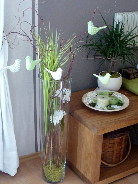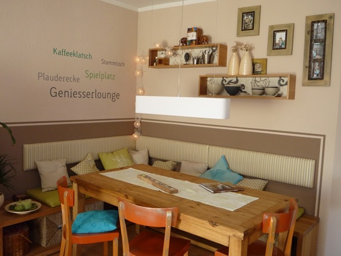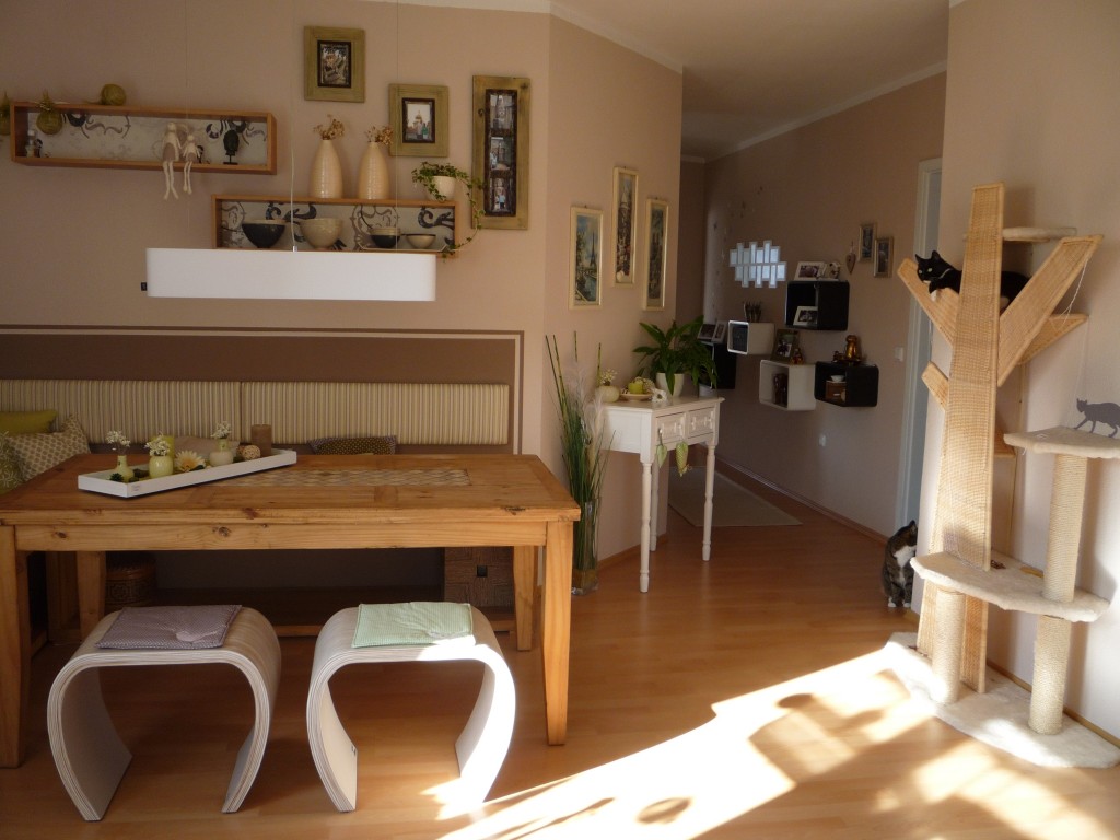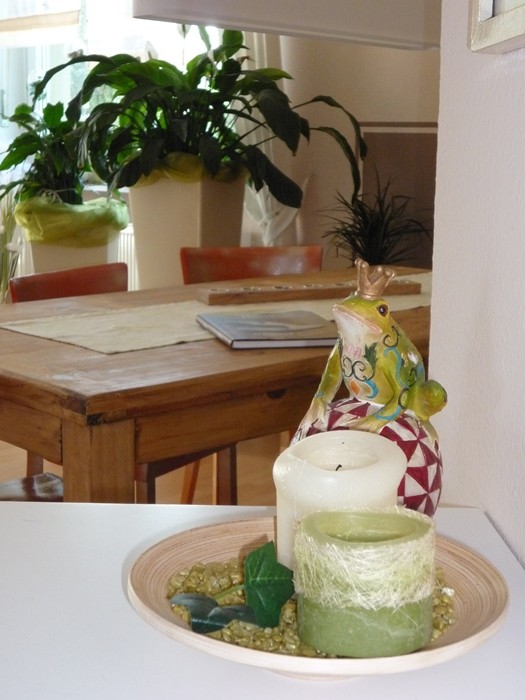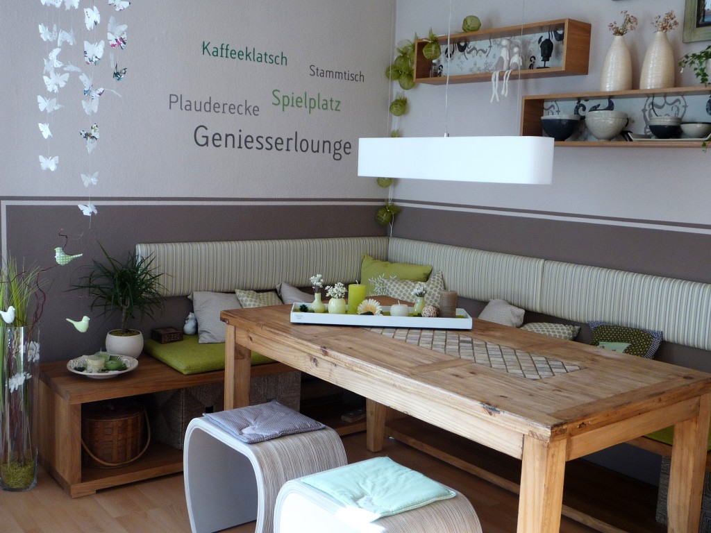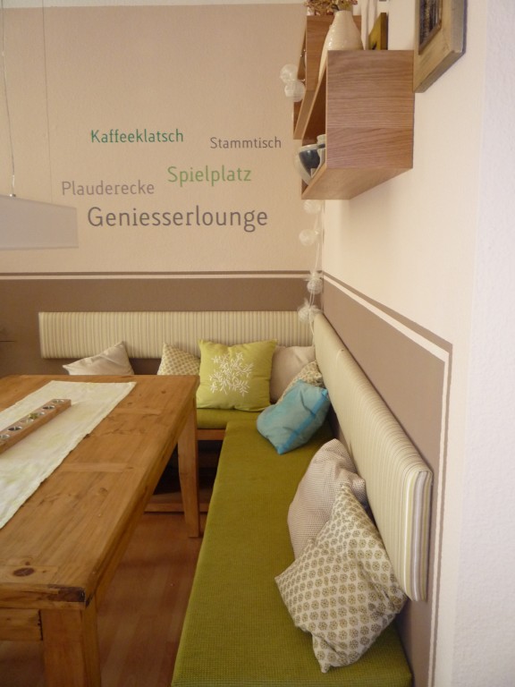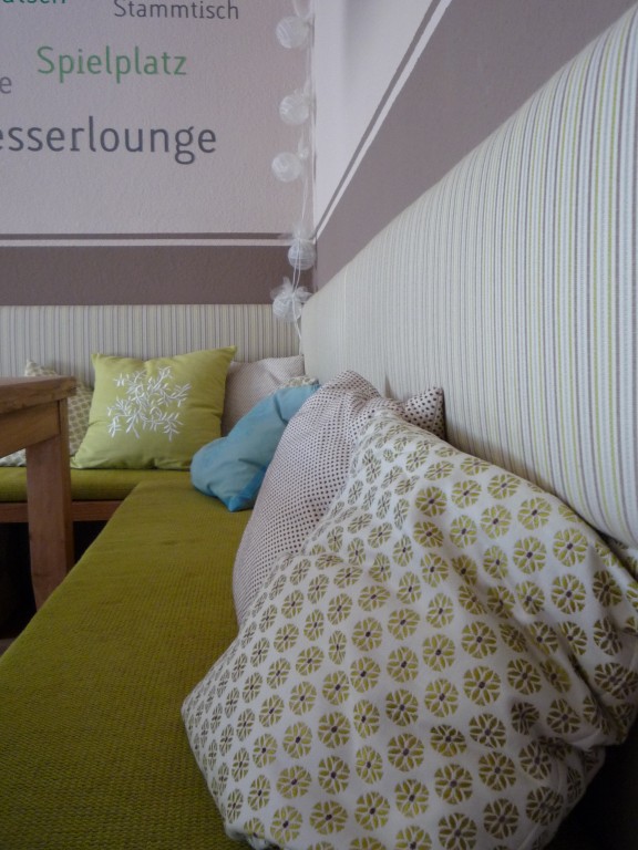 Unsere Sitzecke für gemütliche Stunden. Ein frisches Grün bringt den Frühling. Die orangenen Stühle, ein Relikt aus meiner Studentenzeit, wurden durch modernere Hocker ersetzt.