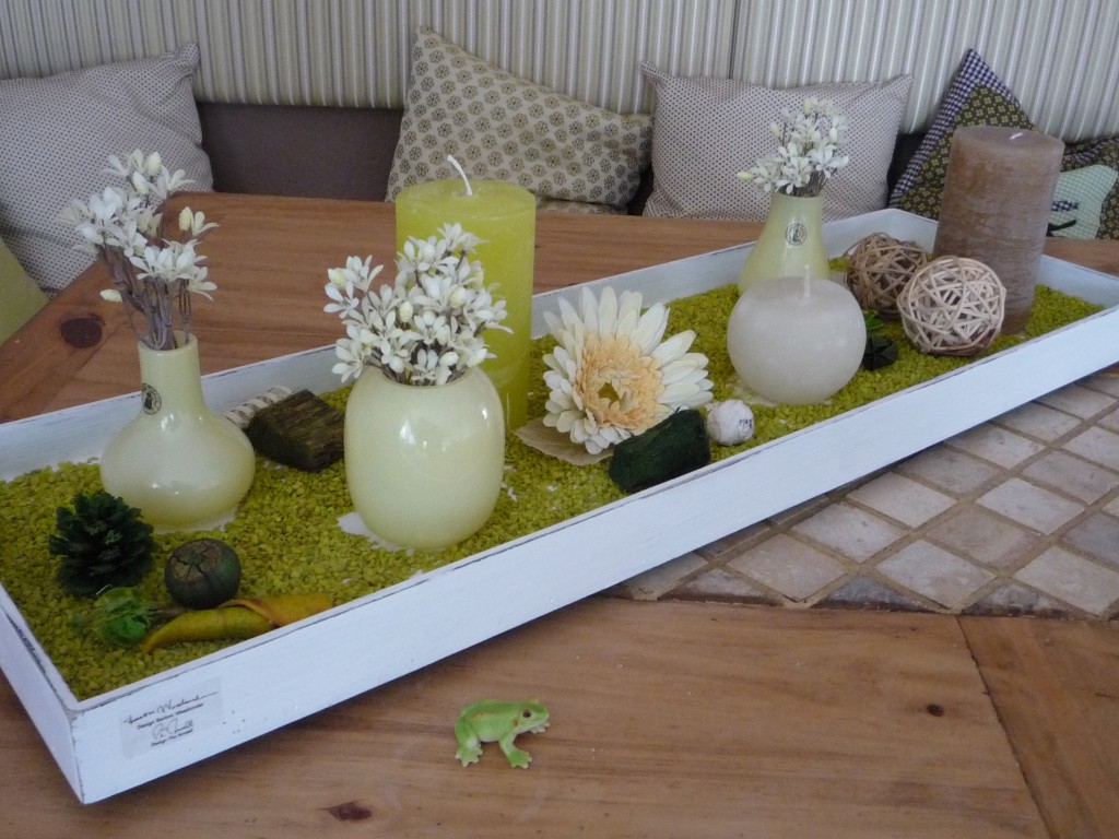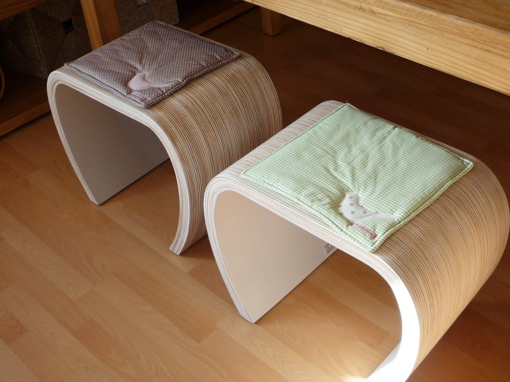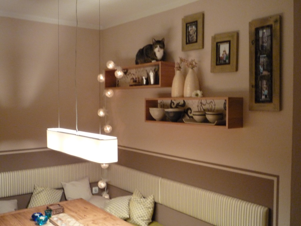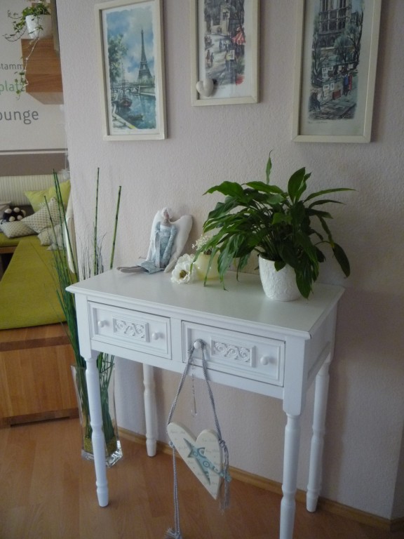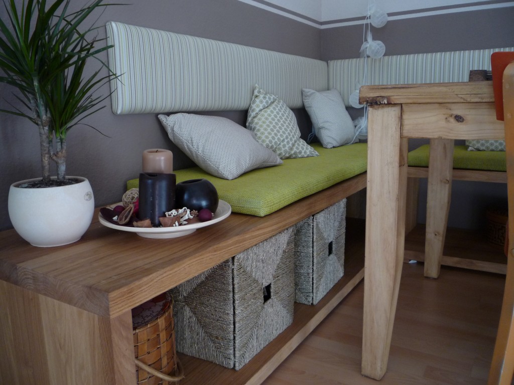Unsere Sitzecke für gemütliche Stunden. Ein frisches Grün bringt den Frühling. Die orangenen Stühle, ein Relikt aus meiner Studentenzeit, wurden durch modernere Hocker ersetzt.