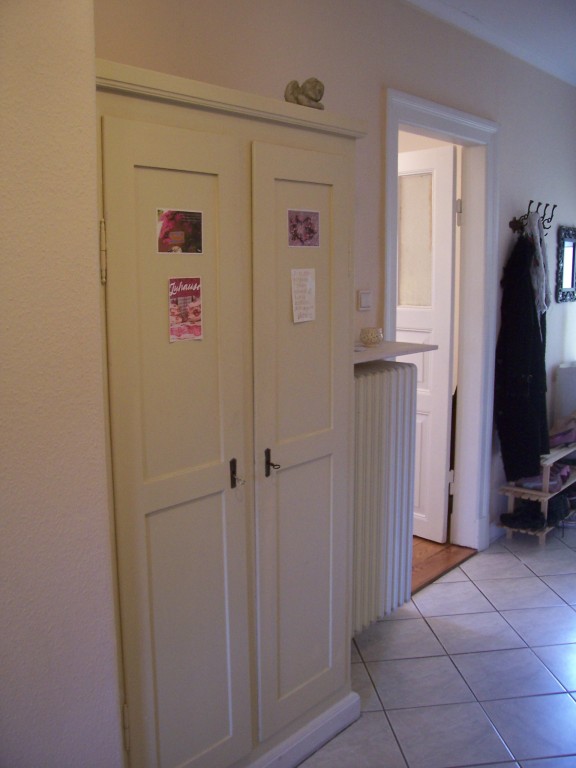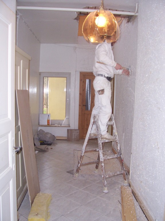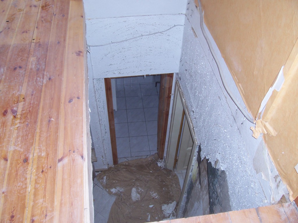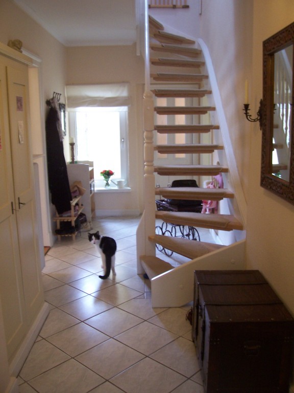 11.747Als wir das Haus das erste mal von innen sahen, hatte es unten keine Treppe, die Zwischendecke war zugezogen. Oben wohnte die Tochter der Vorbesitzer, die über eine Außentreppe nach oben kam, unten wurden die einzelnen Räume vermietet. Die Treppe haben wir im März 2007 natürlich als erstes einsetzen lassen, die Fliesen mussten wir leider so übernehmen. ;-) Es wäre sonst insgesamt zu aufwändig geworden. Ich finde sie zwar nicht unbedingt traumhaft, aber man kann mit ihnen leben. ;-)