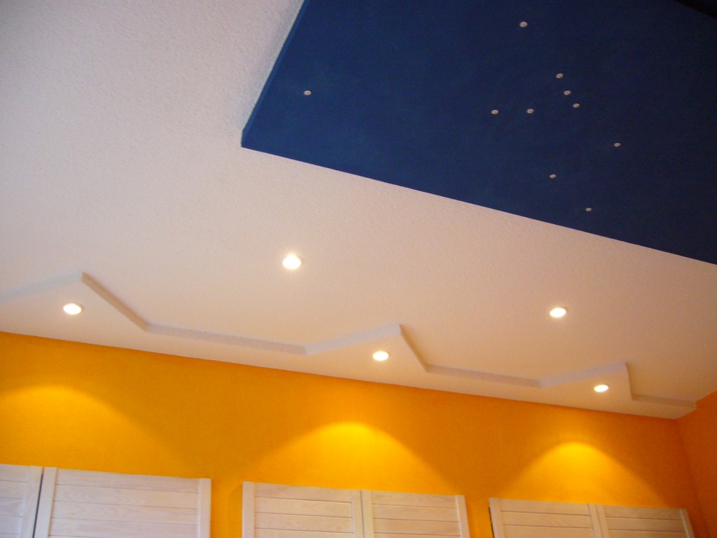 Der Schlafzimmerschrank wird jeweils mittig mit Hallogenstrahlern beleuchtet. Der blaue Sternhimmel ist mit Sternbild Stier und Fische gestaltet. Die Beleuchtung ist LED - Licht.