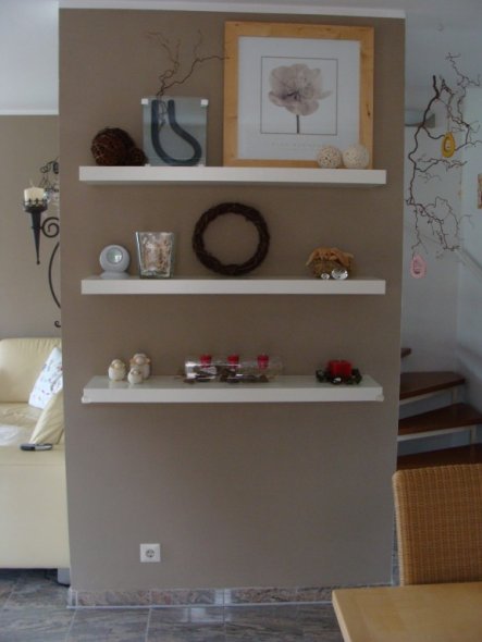 13.688In der Essecke konnte ich das gewischte Terrakotta nicht mehr sehen, deshalb hab ich es mal mit dem neuen Trend Tapete versucht! So jetzt brauche ich aber noch neue Sofakissen, am besten in Brauntönen, damit es zur Wandfarbe Latte Macchiatto passt. Hat jemand einen Tipp, wo es schöne günstige Kissen gibt? Die Deko im Fenster und an der Dekowand hat auch noch Potenzial. Aber da muß mich die Muse küssen, ansonsten wird das nichts. Habe mich unter anderem auch hier angemeldet um Tipps und Ideen zu bekommen, also immer nur her damit!!! Danke schon mal dafür!